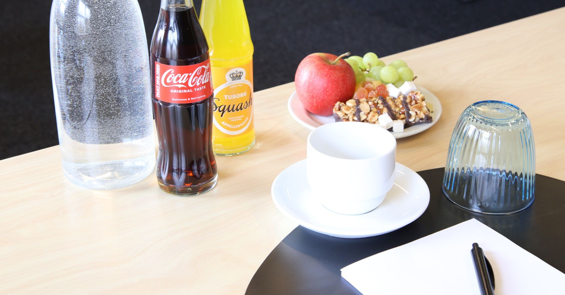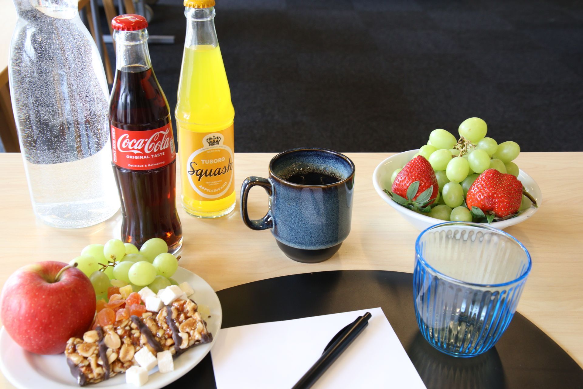 Der er kaffe, te og vand ad libitum med i alle vores mødepakker. Vi sørger for at der bliver fyldt op hele dagen.